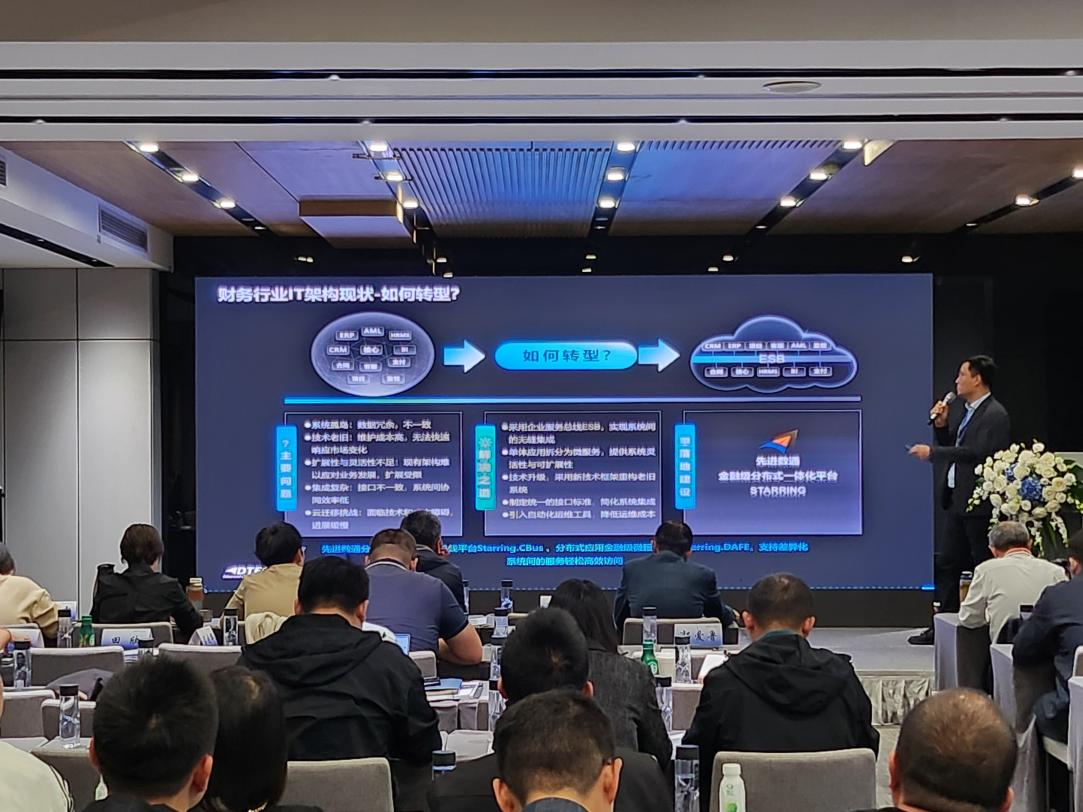米兰(中国)AC米兰代表讲师郭钰以《昆仑与米兰(中国)AC米兰ESB解决方案助力财务行业创新与架构转型》为主题作发言分享。他深入剖析了当前财务行业IT架构面临的挑战,包括系统孤岛、技术老旧、扩展性不足等问题,并提出了基于企业服务总线(ESB)和微服务架构的转型方案。